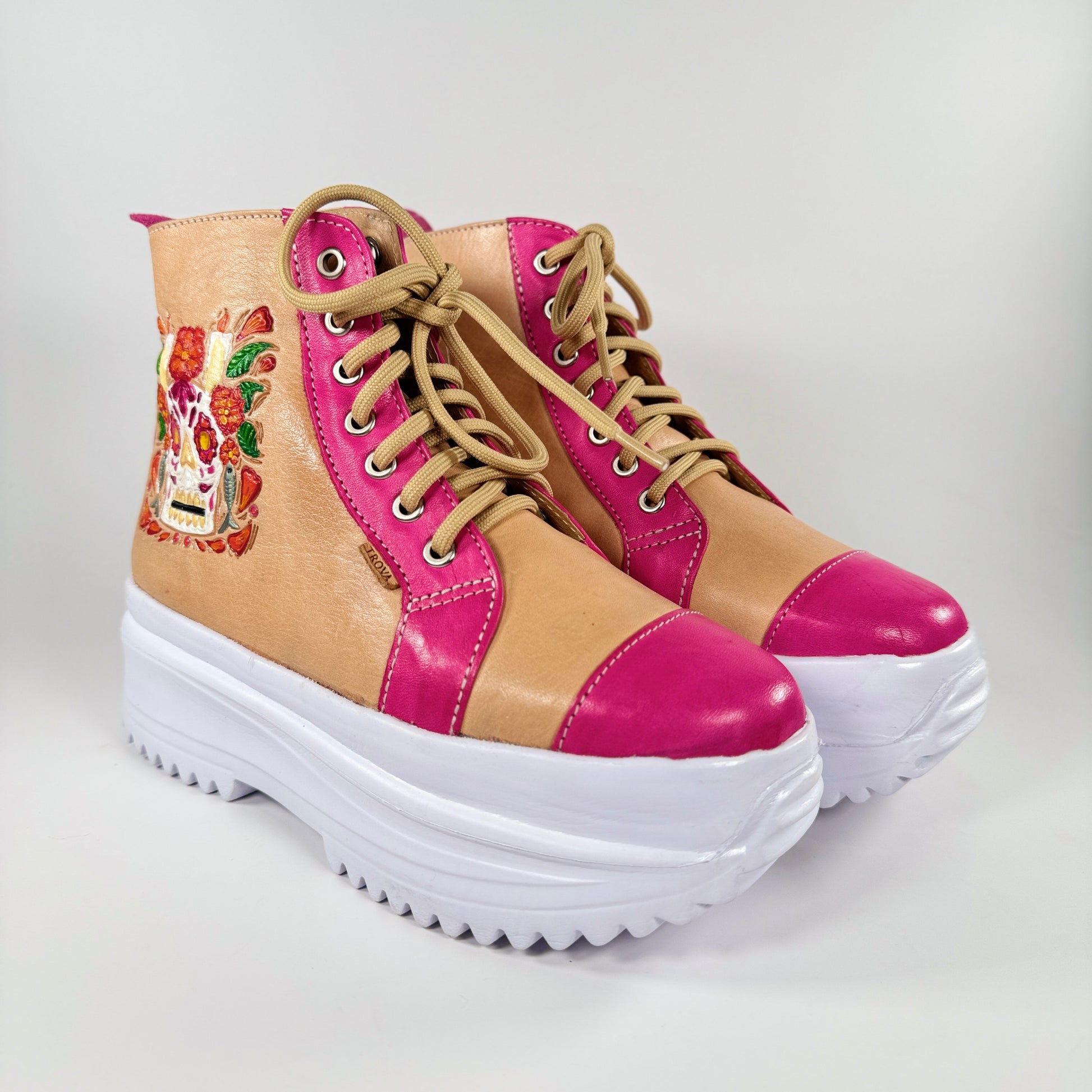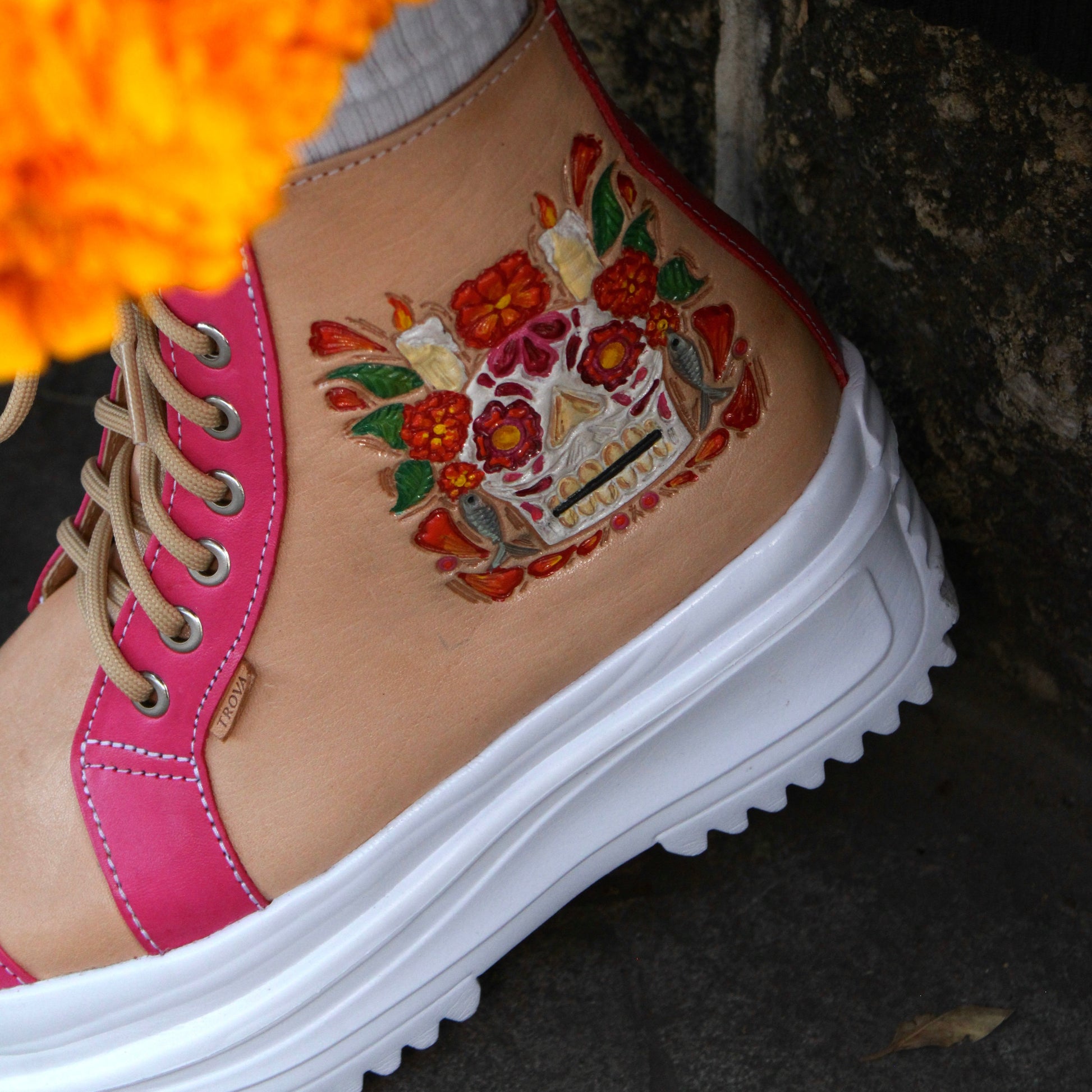 Tenis de piel para dama, pintados a mano con diseño de calavera, alusivo al día de muertos.